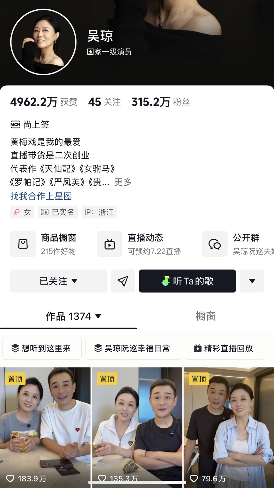 时至今日,中国传统戏曲的境遇有了很大不同,尤其是传播方式的改变带来新的挑战。黄梅戏虽然和曾经的辉煌有着距离,但却是诸多传统剧种中较早“破圈”并成功引来Z时代粉丝的。现年63岁的吴琼紧跟潮流,早早就开通微博账号,拥有9.3万粉丝。而在抖音平台,她更是当之无愧的大V,拥有315.2万粉丝,累计获赞4960.8万。